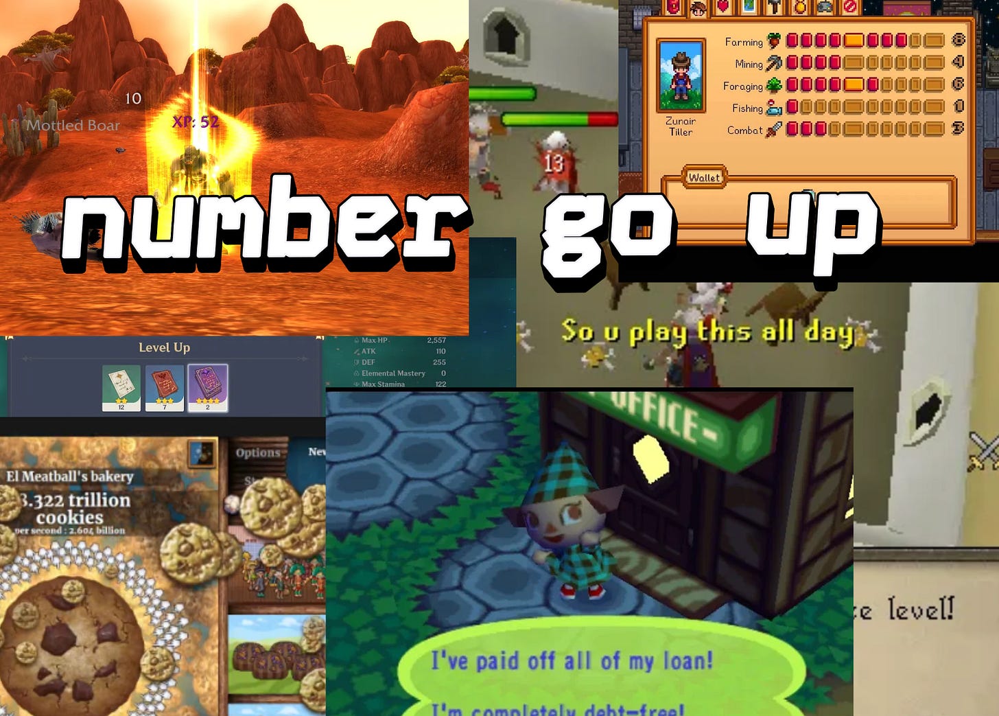 The slang term “grinding” dates back all the way to the 1800s, meaning tedious, repetitive work (see: “the daily grind”). In gaming discourse it means exactly that: a menial task that can (or must) be repeated; in the case of RuneScape, clicking the same thing over and over for several hours at a time. Since the turn of the century, when the home console throttled the arcade industry in its sleep, games that encourage or even explicitly require grinding have become increasingly common—from town sims like Stardew Valley or Animal Crossing, open-world games like Genshin Impact or World of Warcraft, as well as so-called “incremental” games like Cookie Clicker—and most of these have at one time or another been branded as “second jobs.”