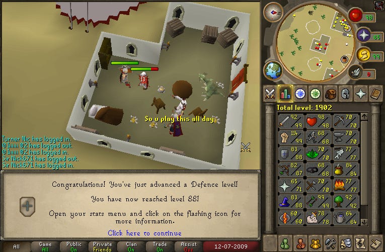 In the summer of 2005, my parents and older brother left town to tour colleges before the start of his senior year. My sisters went to stay with a nearby family, who were known for their superlative cooking. I could have gone with them, but decided to stay home by myself instead. I remember vibrating with excitement as I watched the car pull out of the driveway on Saturday morning, because while everyone else was gone, I could play RuneScape as much as I wanted.